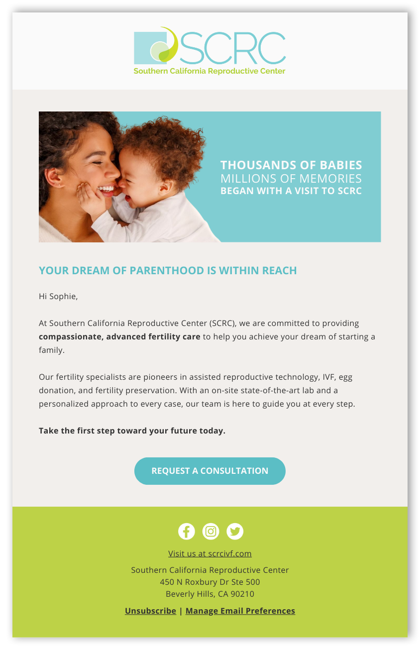 Email marketing was a key component of Southern California Reproductive Center’s (SCRC) digital strategy during my time working on their account at Bonafide. I focused on improving consultation request conversions through strategic testing, segmentation, and thoughtful content development. I partnered closely with SCRC’s internal team to execute data-driven campaigns, build audience-specific nurture workflows, and continuously refine our approach based on performance insights.